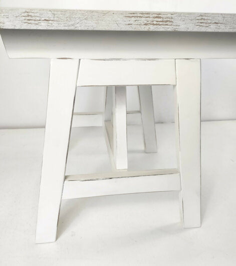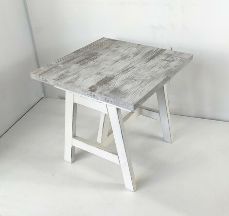 Tavolino da salotto quadrato con base in legno massello laccato bianco panna spigolato, piano in nobilitato 3d effetto legno invecchiato bianco shabby.